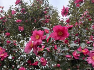 冬の駐輪場横を彩るサザンカの花