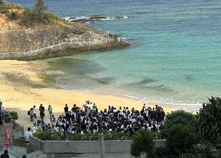 その後は、今回の修学旅行の大きな学びの一つであるタクシー研修を行いました。班ごとに事前に計画したコースに基づき、沖縄県内のさまざまな施設や観光スポットを巡りました。美ら海水族館やアメリカンビレッジなど、それぞれの班が工夫を凝らしながら行動し、沖縄の自然や文化、歴史に触れる貴重な時間となりました。国際通りでは、家族へのお土産を選ぶ姿も見られ、旅の締めくくりにふさわしいひとときとなりました。