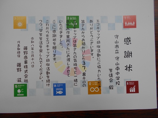 生徒会未来委員会ではペットボトルキャップ回収活動を行っていますが、2月16日、校内で集めたキャップを正副委員長が藤野商事株式会社様へお渡ししたところ、本校の取組に対して感謝状をいただきました。生徒たちが継続してきた活動が評価されたことを、大変うれしく思います。