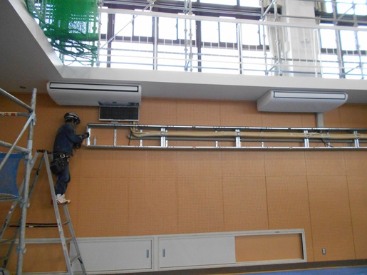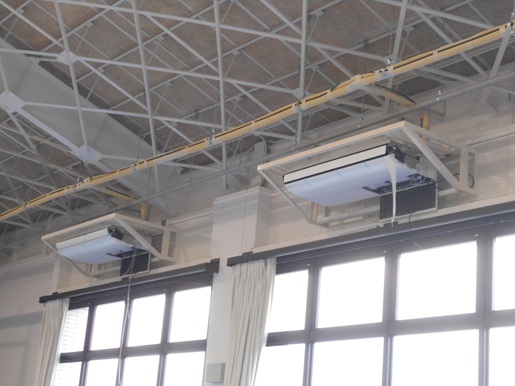 現在、市内4中学校の体育館で空調設備工事が行われており、本校でも連日、工事業者の方々が体育館の内外で作業にあたっておられます。