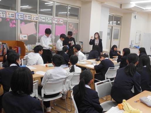 説明では、実際に図書館に足を運びながら、利用方法を学んだり、図書の分類についてクイズ形式で考えたりするなど、子どもたちが本や図書館に興味をもてるよう工夫がされています。生徒たちは楽しみながら話を聞き、積極的に参加する様子が見られました。