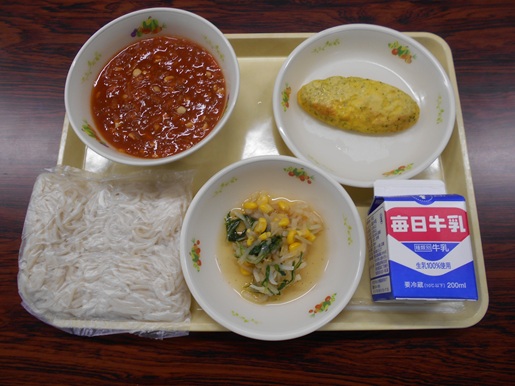 最終日のメニューは、ソフト麺、牛乳、ほうれん草オムレツ、大根と水菜のサラダ、ミートソースでした。子どもたちにとって親しみのあるメニューで、締めくくりにふさわしい献立となりました。