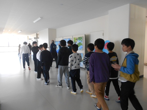 はじめに全体であいさつを行った後、学校ごとに日頃の取組について発表を行いました。少し緊張した表情も見られましたが、発表に対してうなずいたり拍手を送ったりする姿があり、温かな雰囲気の中で交流会がスタートしました。また、会の後半には本校生徒が学校生活の様子についてスライドを用いて説明し、その後、案内役となって校舎探検を行いました。