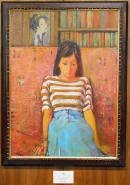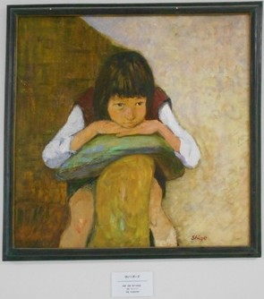1点目は南校舎1階のフリースペース横の掲示板に掲げてある、「はい!ポーズ」という作品です。2点目は同じく3階美術室前に掲げてある「頬杖」という作品です。3点目は生徒の皆さんはめったに目にしない校長室内の壁面に掲げられている「初夏」という作品です。