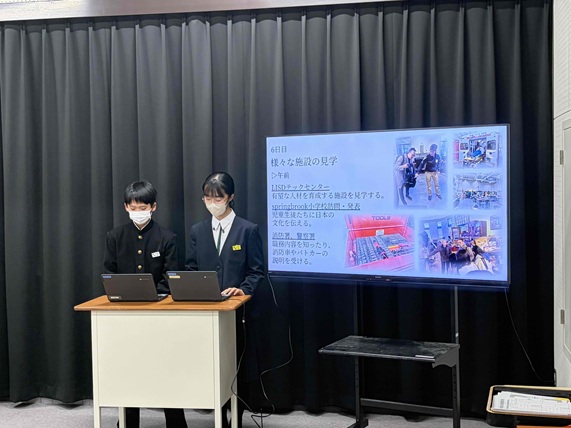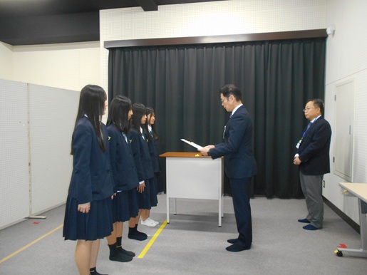 その後、レナウイ郡への海外派遣に参加した本校生徒2名から、派遣先での様子やその時の思い、現地での交流について、写真などを交えながら分かりやすく発表してくれました。続いて、2学期中に部活動や各種展覧会等で優秀な成績を収めた生徒への表彰伝達を行いました。