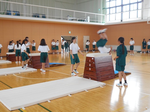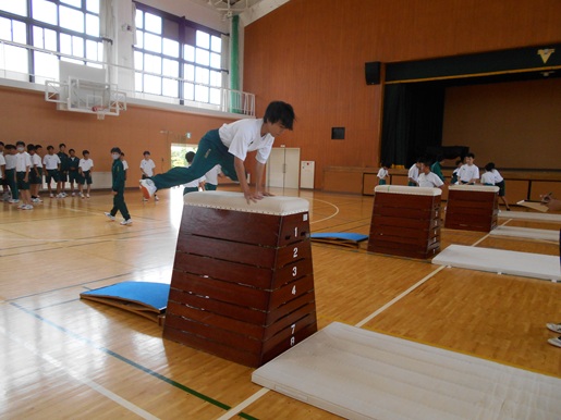 体育館の前を通りますとロイター板を強く踏む音が聞こえましたので、のぞいてみましたら2年生が跳び箱に挑戦していました。