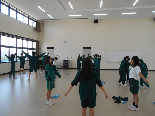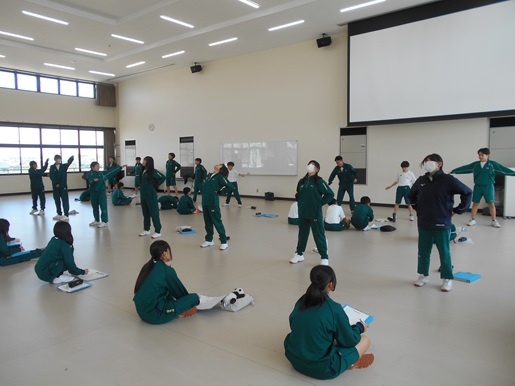 授業では班ごとに分かれ、お互いの動きを見合いながら、「腕はしっかり伸びているか」「リズムに合っているか」など、細部に目を向けて確認しています。生徒たちは真剣な表情で取り組み、より正確で効果的な動きを目指して練習を重ねています。