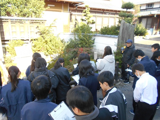 社会科の地理的分野では、地域調査などの具体的な活動を通して地理的事象への関心を高めることなどが求められています。本校の2年生は、学校周辺の野外調査として金森町周辺を訪れ、外部講師の方から解説をいただきながら地域を巡りました。