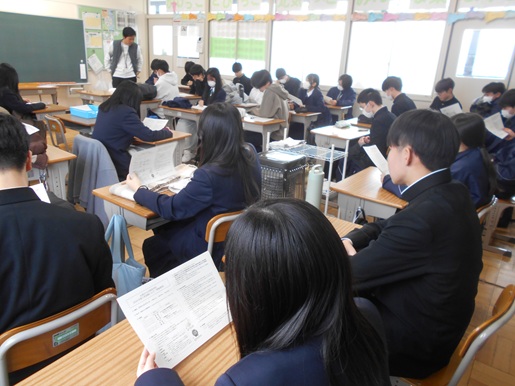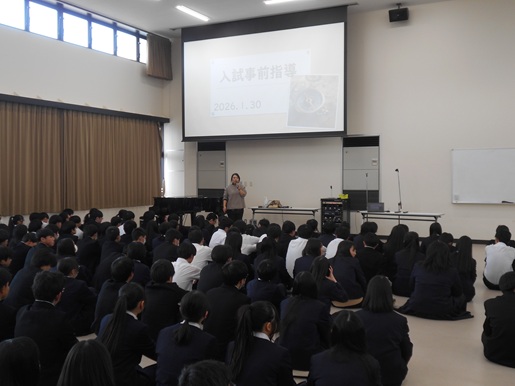 会場には3年生全員が集まり、静かで引き締まった雰囲気の中、黙々とした真剣な姿勢で指導に臨んでいました。はじめに学校長から、これまでの努力をたたえつつ、本番に向けた激励の言葉があり、その後、進路担当教員から入試当日の心構えや注意点など、具体的な説明が行われました。