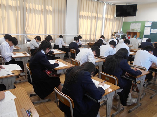 朝、校舎内の3年生の廊下を歩いていますと、朝読書の時間ではありましたが、今日の実力テストに向けて参考書や問題集を開き、最後の確認をしている姿が見られました。その様子からは、ほどよい緊張感が伝わってきました。本日は5教科のテストに集中する一日となり、たいへんお疲れさまでした。